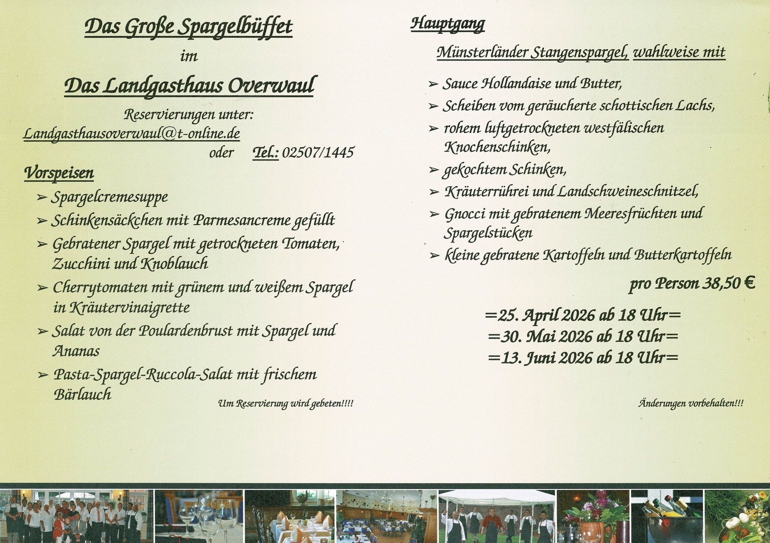 Für Ihre Feierlichkeiten jeglicher Art beraten wir Sie gern nach Terminabsprache zur Menüauswahl, unseren Gerichten und Ihren Möglichkeiten bei uns. Wir helfen Ihnen in allen Fragen. Kontaktieren Sie uns oder kommen Sie auf ein leckeres Mittagessen oder Abendessen in unser Restaurant in Havixbeck bei Münster. Unser Chefkoch Christian Overwaul zaubert Ihnen internationale Spezialitäten, regionale Küche und eigene Kompositionen. Ein echter Genuss für jeden Gast.